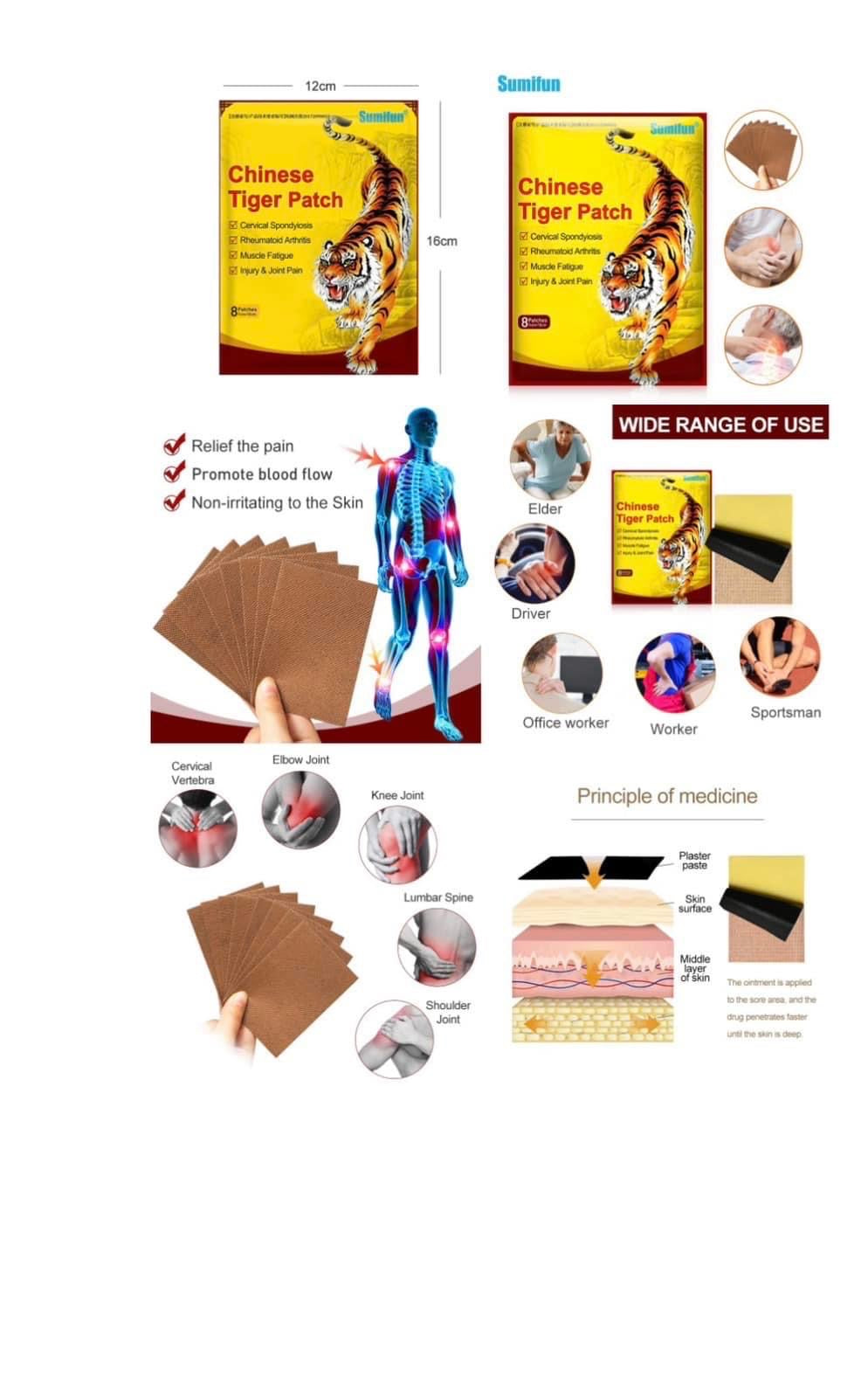Plaster tygrysi, plaster stosowany w leczeniu bólu kręgów szyjnych, zapalenia barku, przepukliny dysku lędźwiowego, reumatoidalnego zapalenia stawów, urazów po upadku, bólu pleców i nóg, poprawiający jakość kości (8 plastrów w opakowaniu)